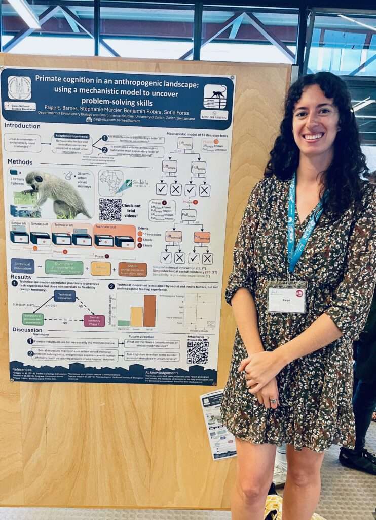 The students of the Urban Vervet Project have had a productive Summer presenting our latest results on primate adaptations to anthropogenic environments at both the European Federation for Primatology’s conference in Lausanne in June 2024 and here at our home institution at the University of Zurich at the European Conference for Behavioural Biology 2024. On the picture: Paige Barnes, presenting her mechanistic model disentangling behavioural flexibility and technical innovation during a problem-solving task of urban vervet monkeys.